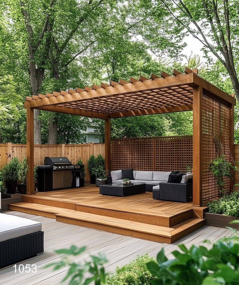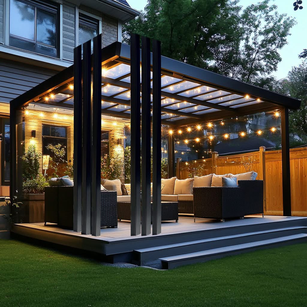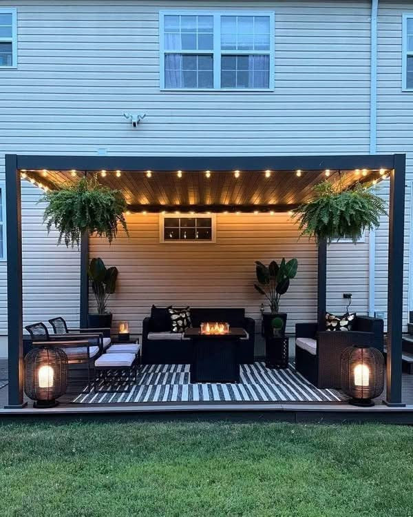 Imagine a serene evening under a beautifully crafted wooden pergola, surrounded by the warm glow of string lights. A stylish stone fire pit flickers at the center, casting a cozy ambiance over plush wicker seating adorned with vibrant cushions. The lush greenery and blooming flowers enhance the inviting atmosphere, making it the perfect space to relax, entertain, and create unforgettable moments under the stars.